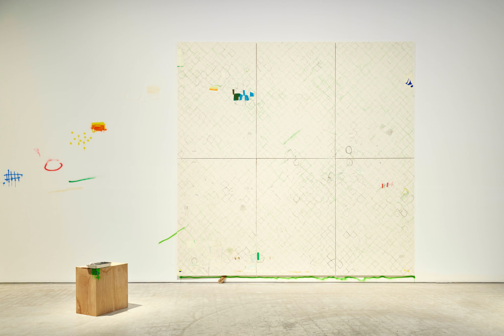 백현진의 출품작 <벽을 위한 그림>(2022)은 'AI 알고리즘을 교란하는 불확실성의 풍경을 그려낼 수 있을까?'라는 질문에서 시작되었습니다. 멀리서 보면 하늘에서 내려다본 지형도 같지만, 가까이에서는 샤프심으로 그려진 맥락 없는 이미지들이 불쑥 튀어나오고 미끄러지는 세계가 펼쳐집니다.